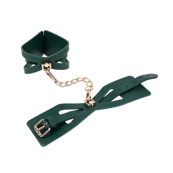 Get wrapped up in something irresistible. These emerald green cuffs feature dramatic cutout detailing to reveal more skin and spark more intrigue. Lined for softness and designed for visual seduction, they’re as comfortable as they are commanding. Use them to bind wrists together or attach to other Indica items for a coordinated scene. The gold chain and hardware add just the right touch of luxury to every surrender.
