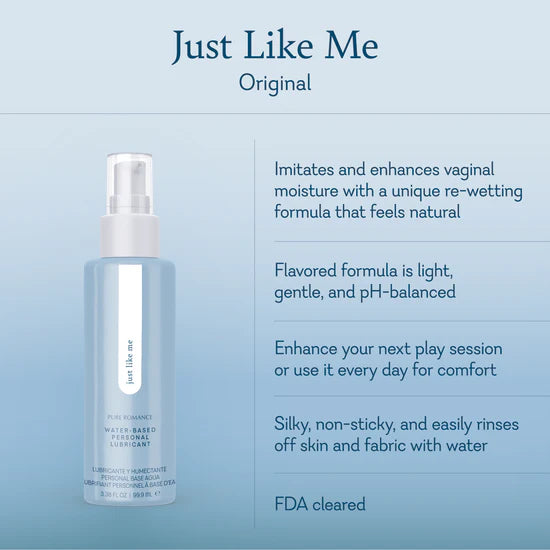 Finally, a lubricant that feels just like you. Just Like Me is perfect for getting intimate or everyday use. This light, water-based and pH-balanced lubricant is carefully formulated to imitate vaginal moisture. Apply as needed and enjoy. Just Like Me Original contains no added flavors.